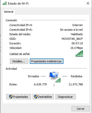 Ahora se abrirá una ventana de estado para la conexión WLAN. Selecciona "Propiedades inalámbricas"