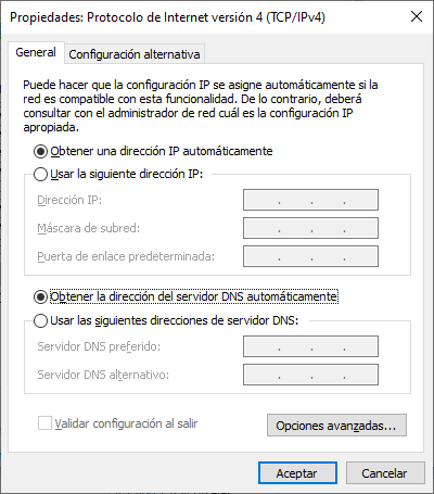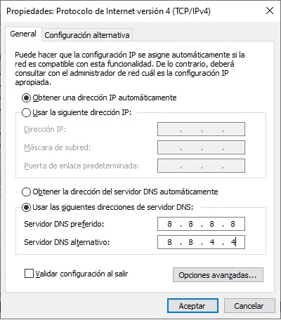 Marca la opción Usar las siguientes direcciones de servidor DNS e indica las DNS de Google: 8.8.8.8 y 8.8.4.4
